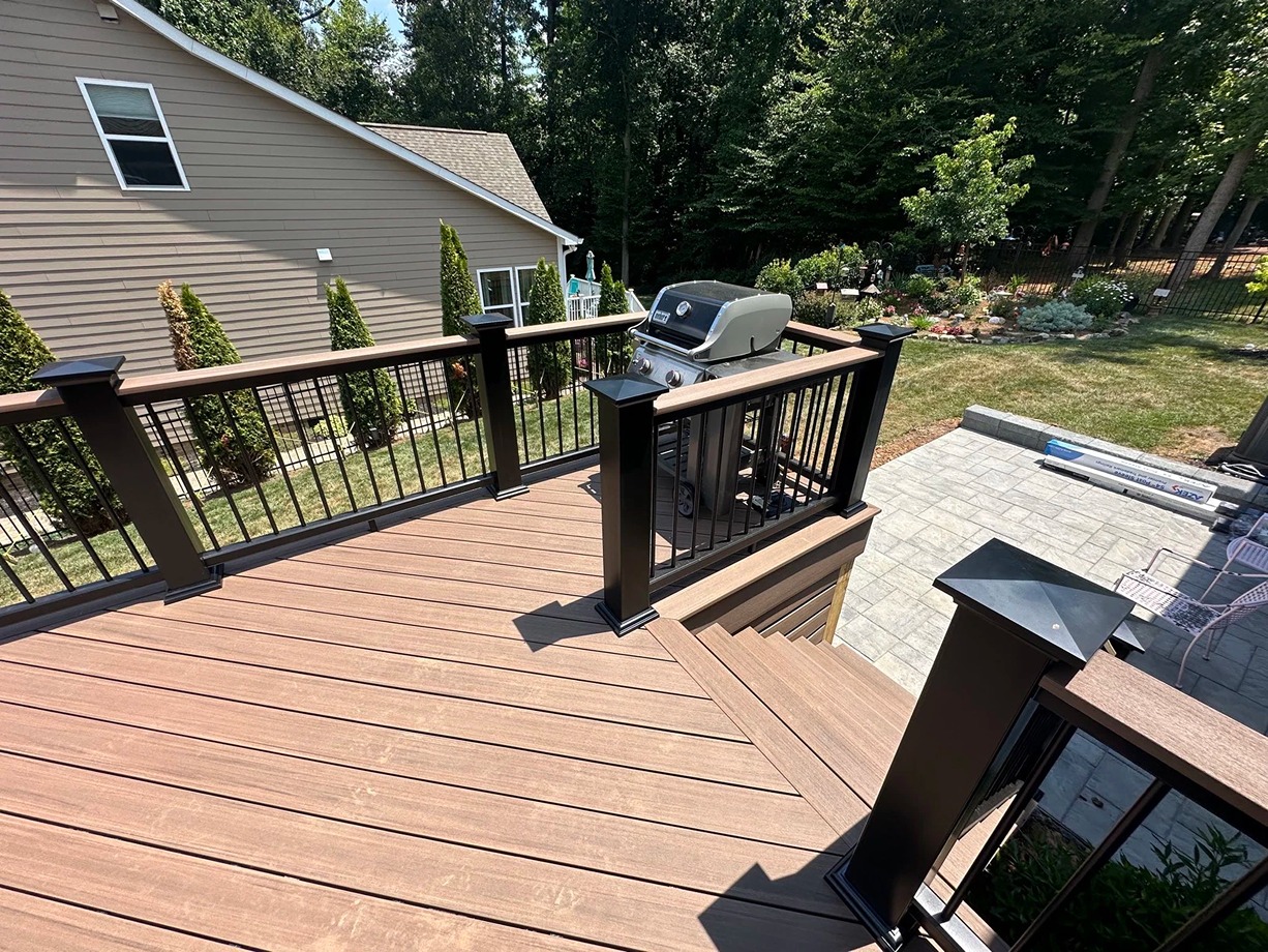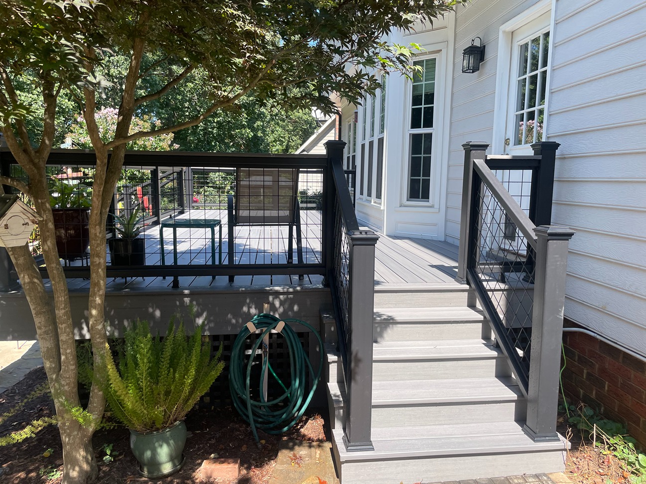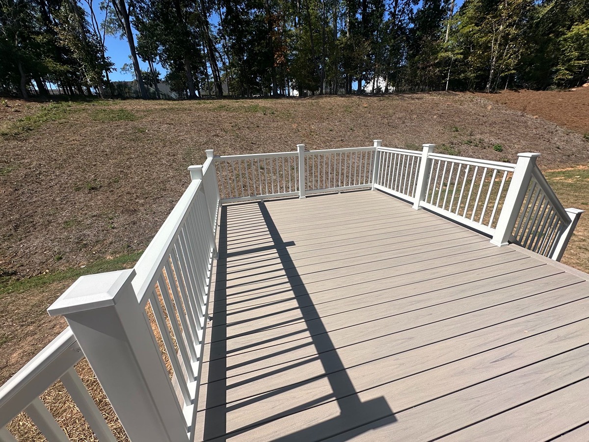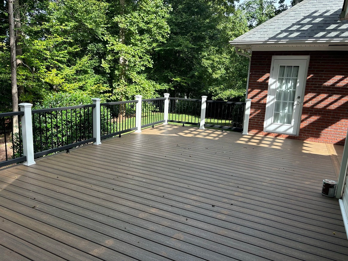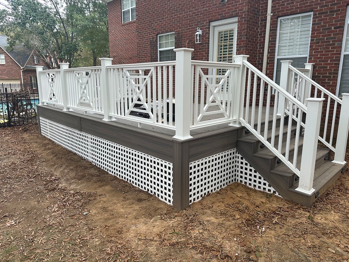 Decks Decks Gallery Book a free consultation today Home » Gallery » Decks Trex Clam shell with white Select railing view 1