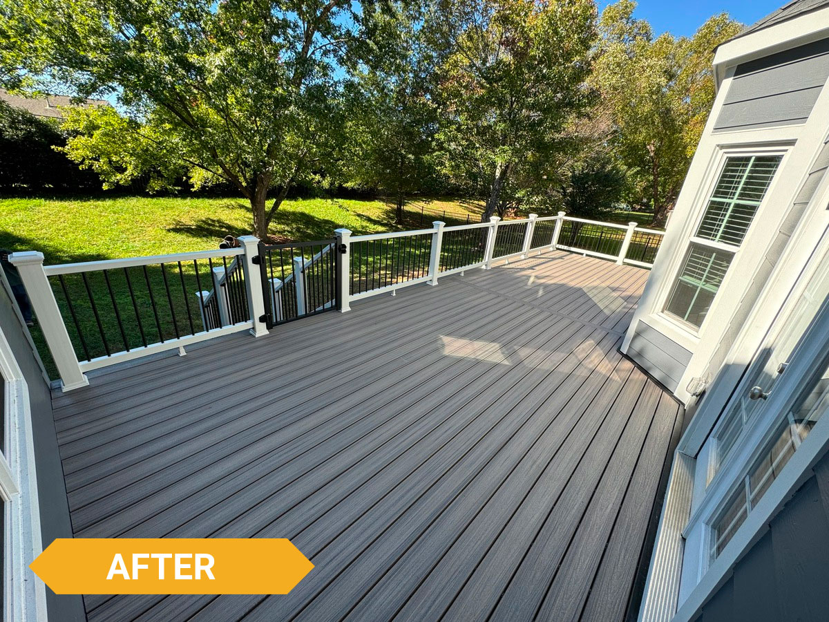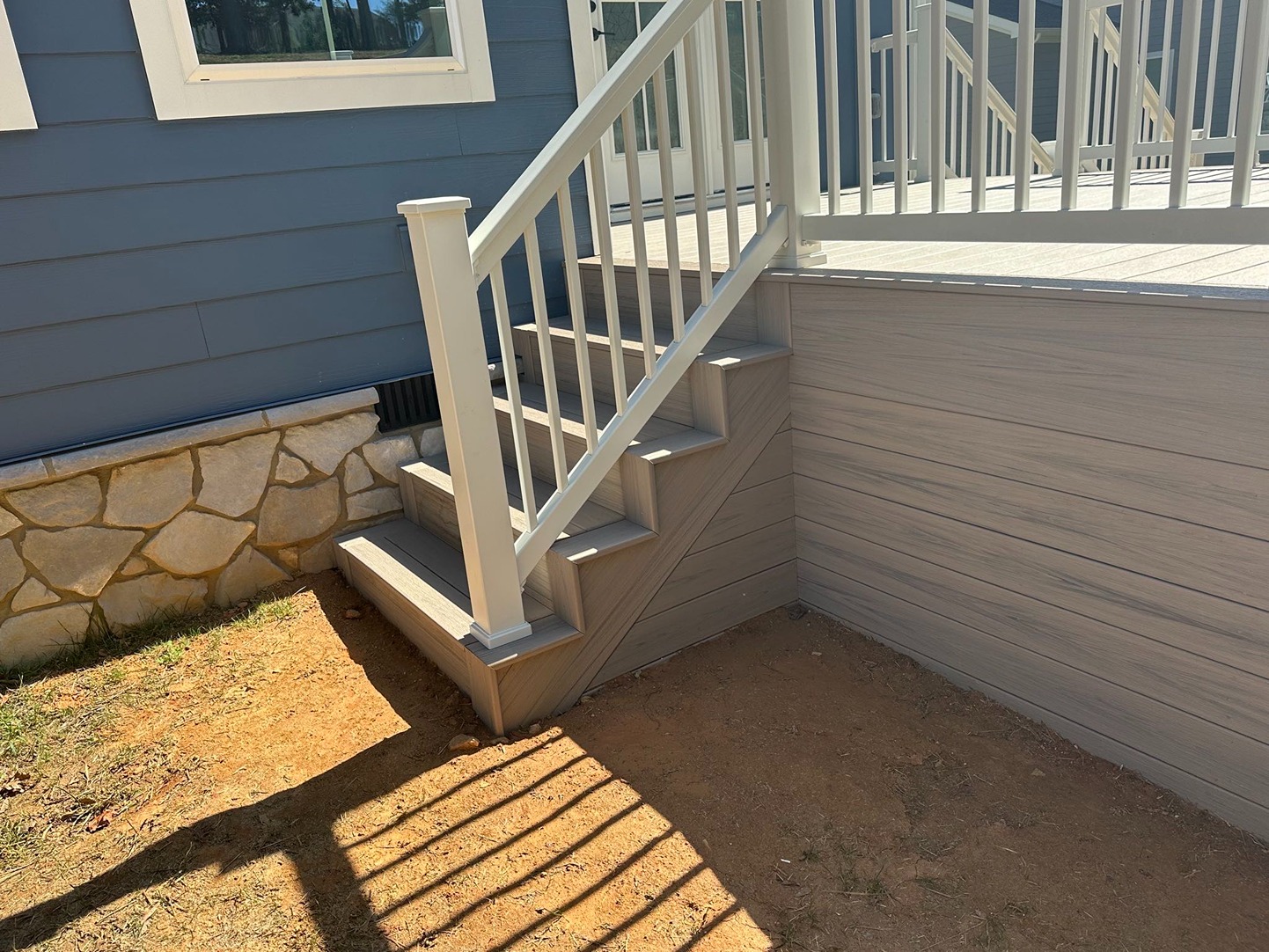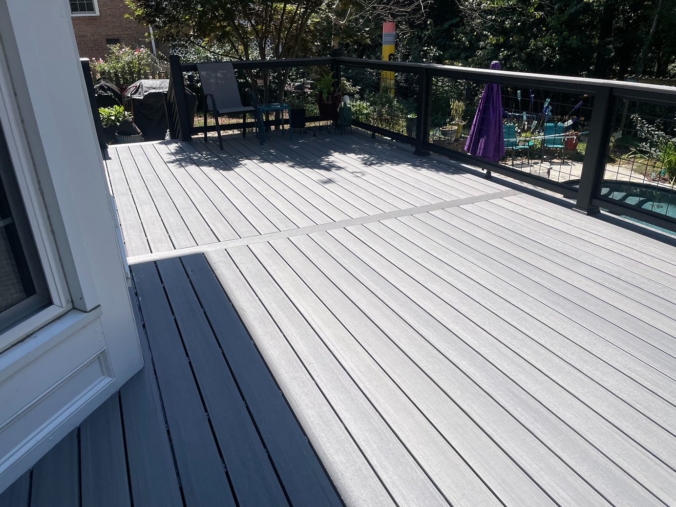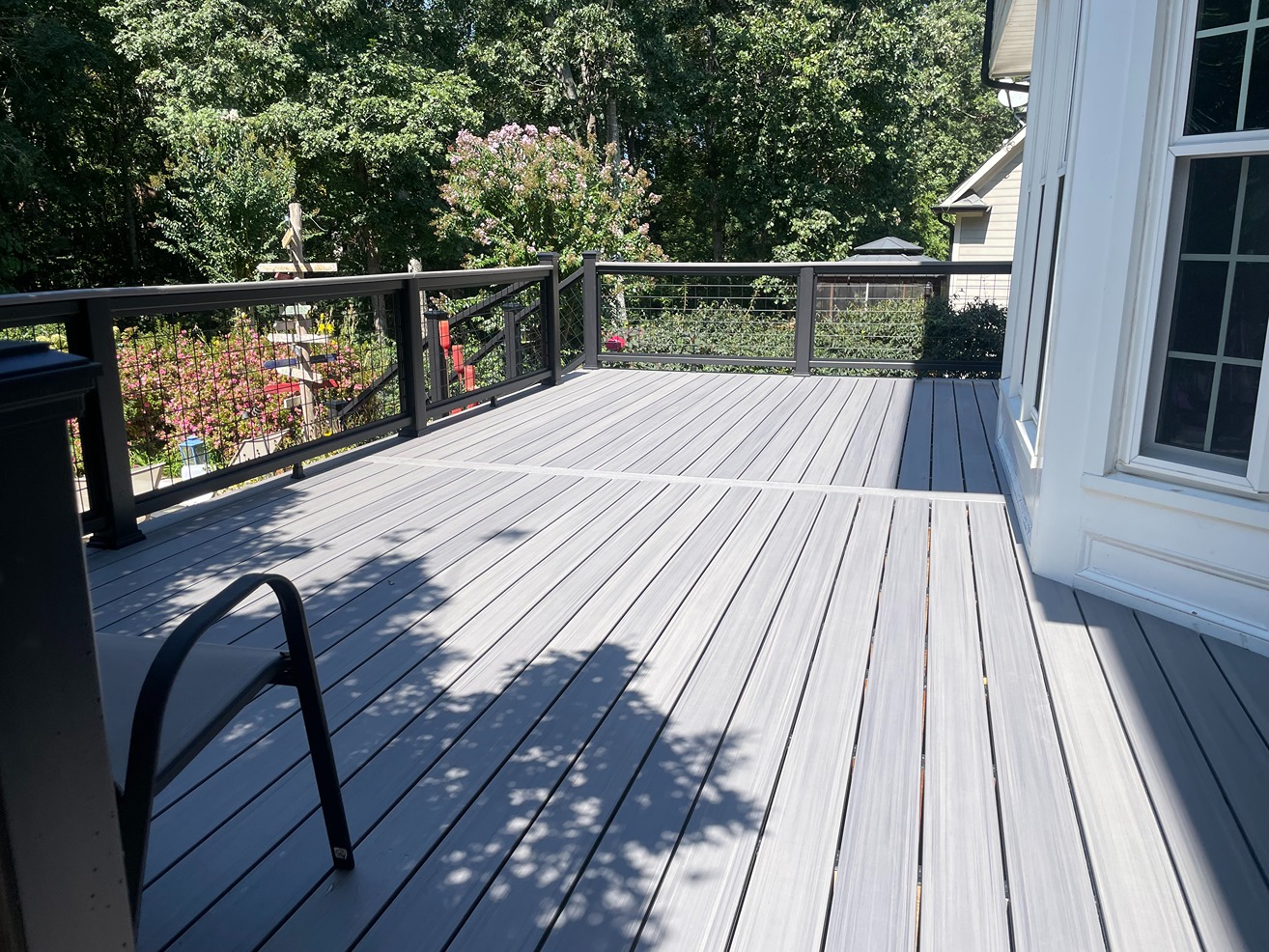 Decks Decks Gallery Book a free consultation today Home » Gallery » Decks Trex Clam shell with white Select railing view 1