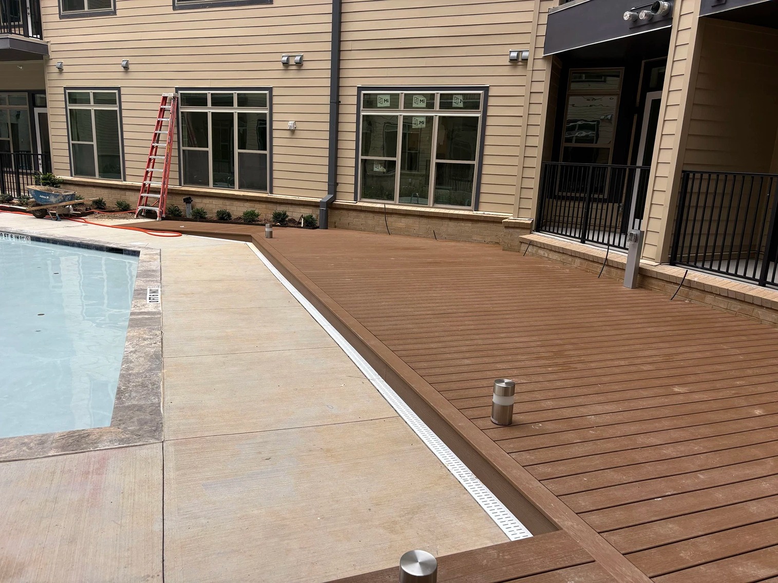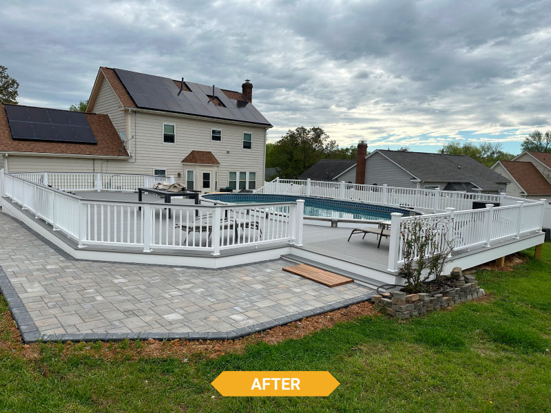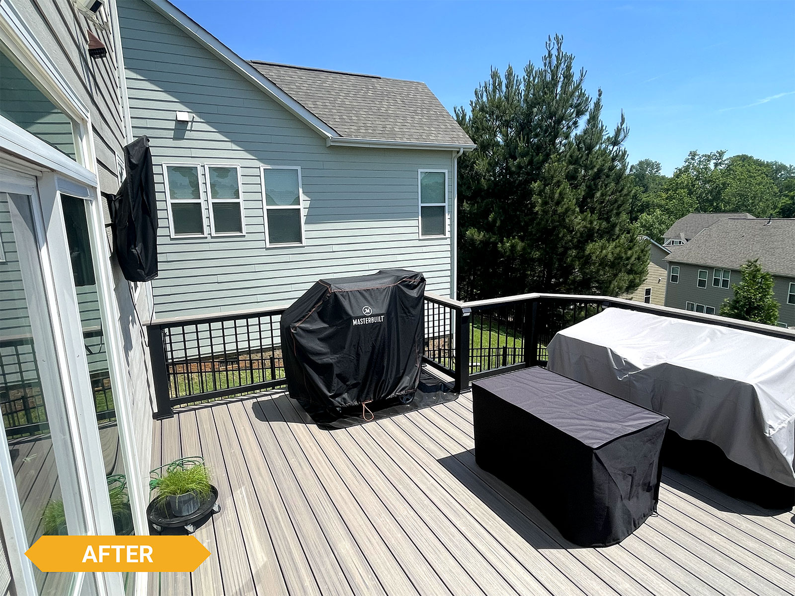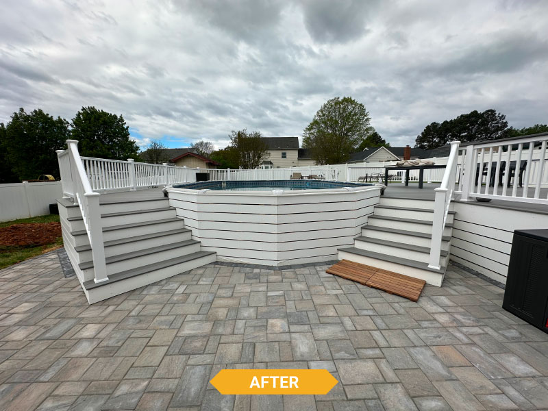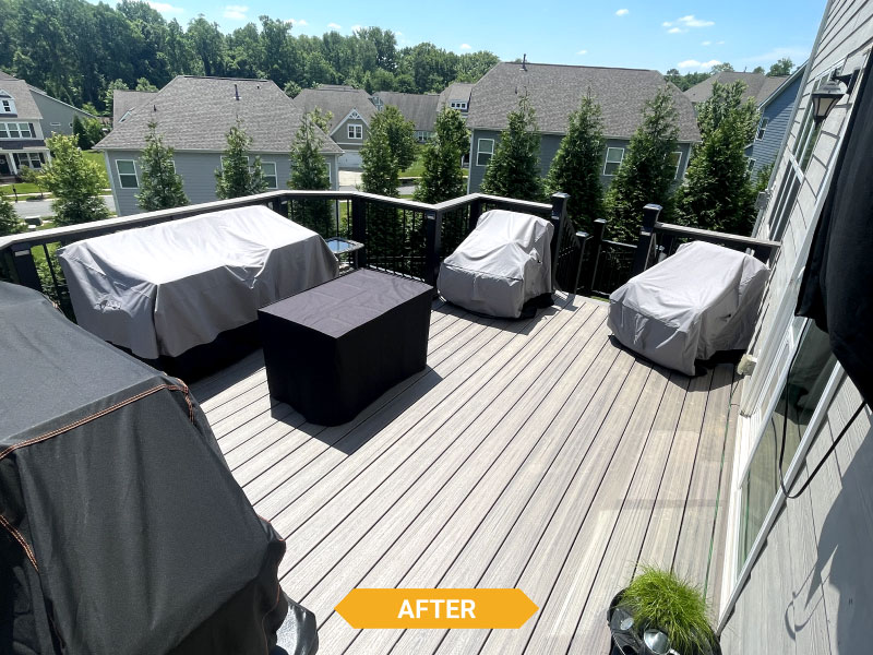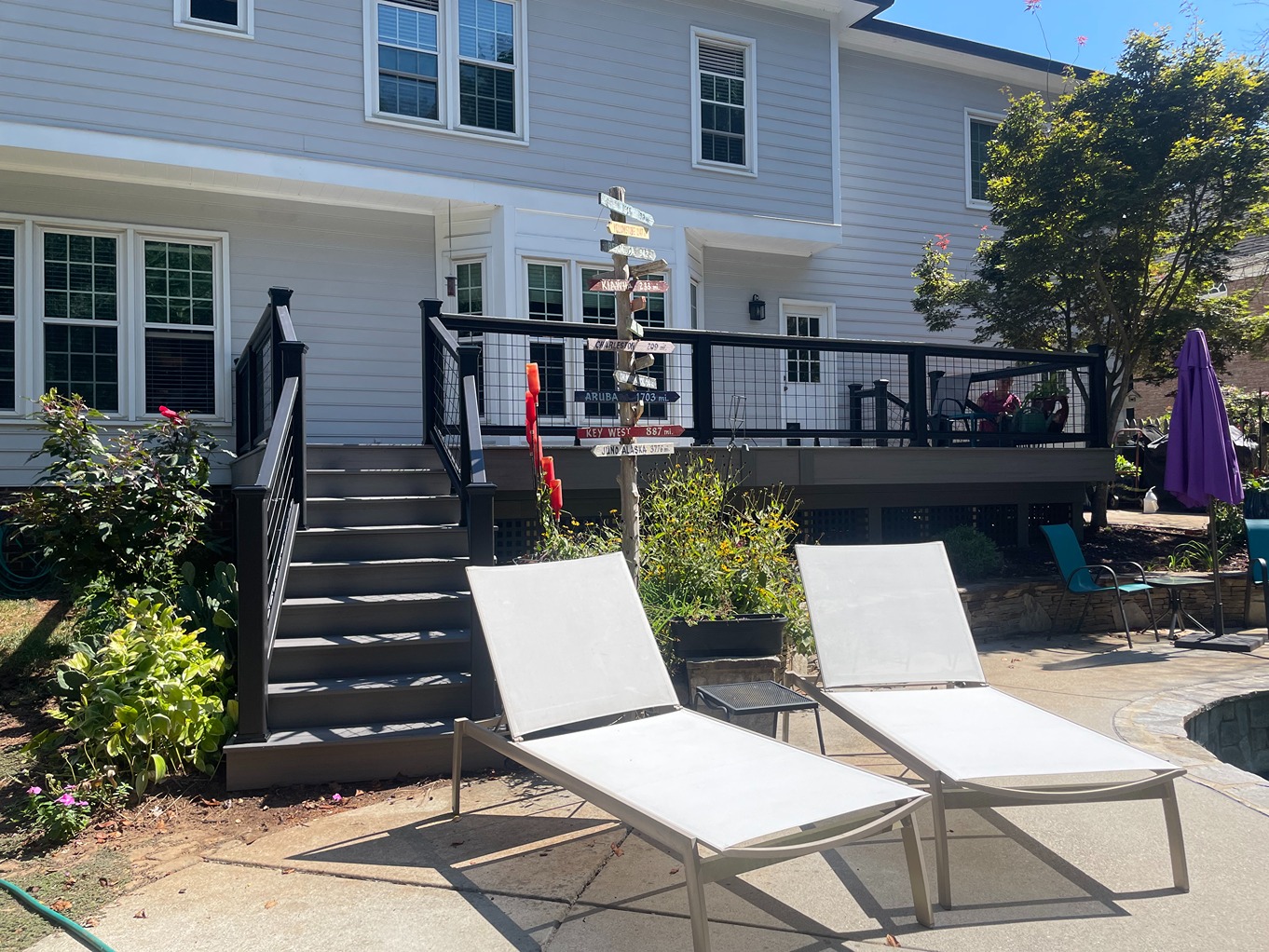 Decks Decks Gallery Book a free consultation today Home » Gallery » Decks Trex Clam shell with white Select railing view 1